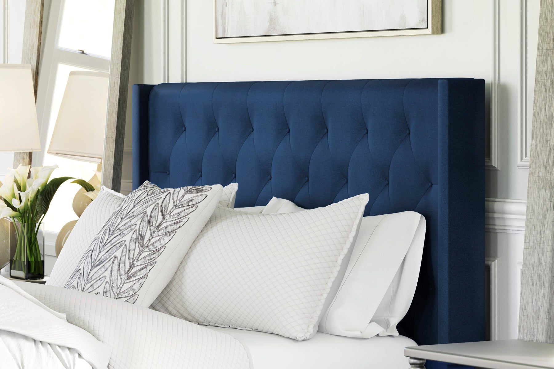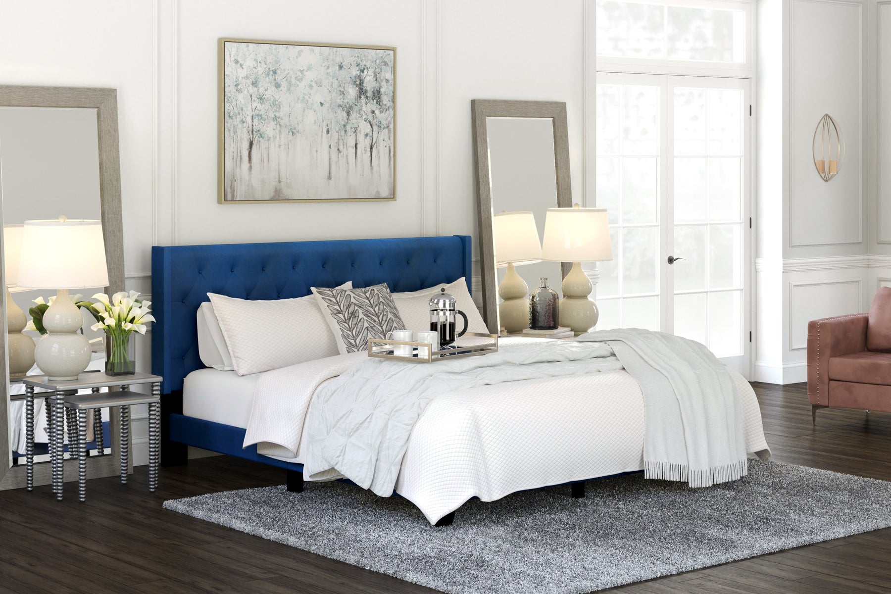 Tastefully edited lines with distinctive button tufting, elegantly proportioned wings and a double row of nailhead trim give this fully upholstered bed the rich contemporary look you’ve been longing for. But this queen bed's real beauty? Its upscale design comes at a surprisingly low price. Finally, an affordable option for those with expensive taste.