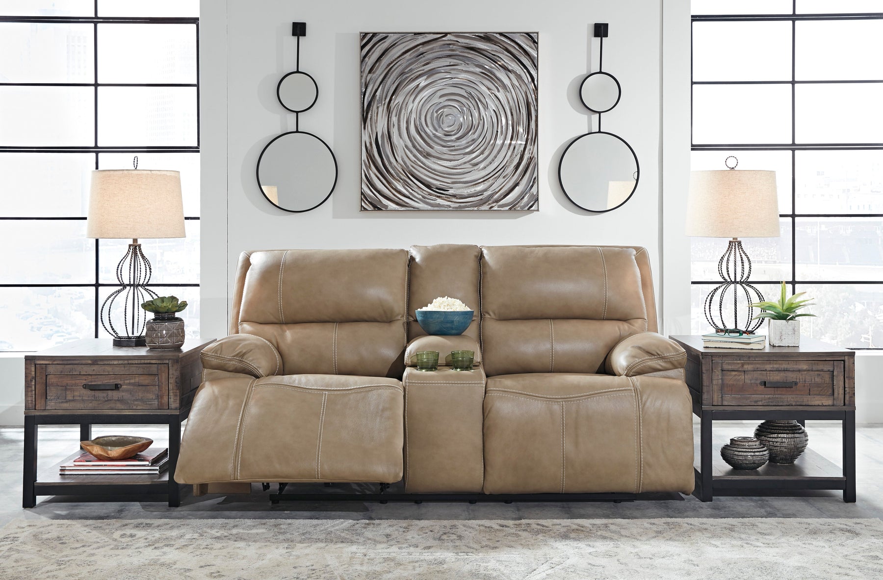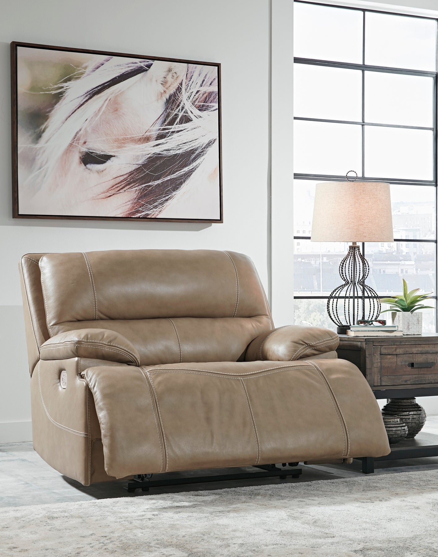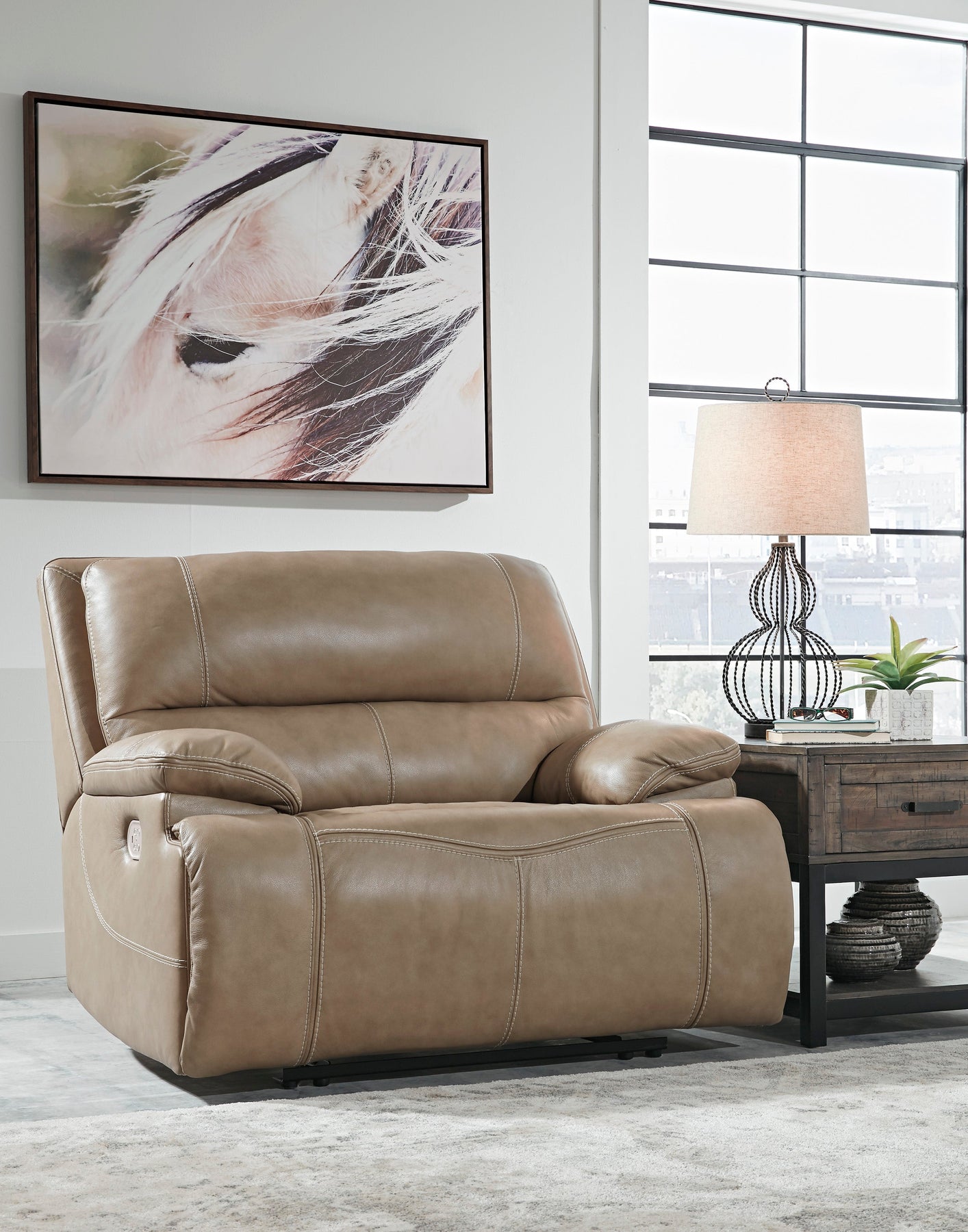 Life is so much better when you can enjoy the pleasure of real leather—at a price to put you at ease. That’s exactly what you get with this power reclining sofa. Thanks to real leather throughout the seating area, you've got a reclining sofa that feels like a million bucks but won’t break the bank. Tailored to those with an eye for contemporary design, this power reclining sofa is dressed to impress with an upscale matte finish, clean-lined divided back tufting, distinctive jumbo stitching and chic pillow top armrests. Perhaps best of all: Easy View™ power adjustable headrests let you recline back and still have a primo view of the TV.