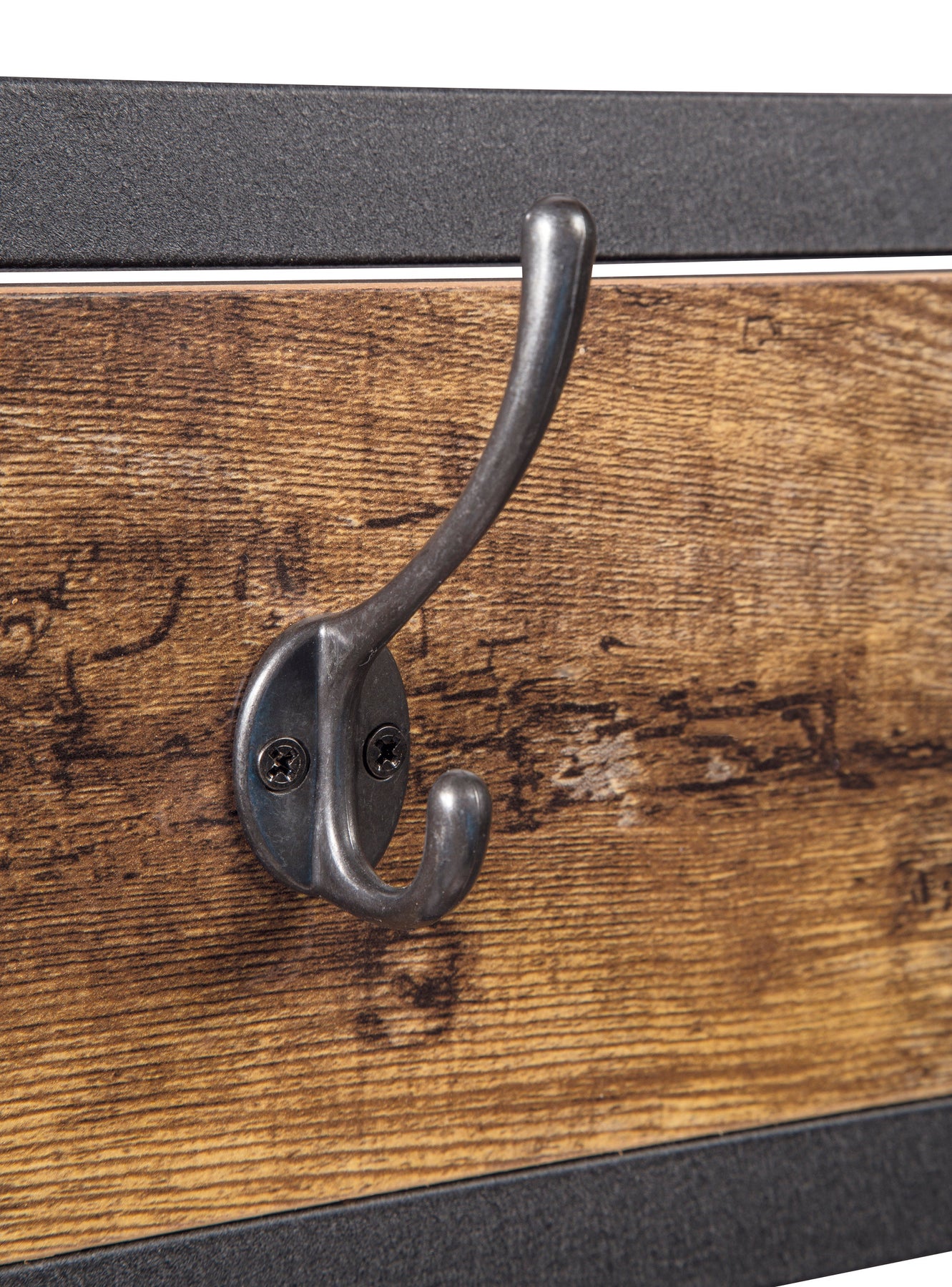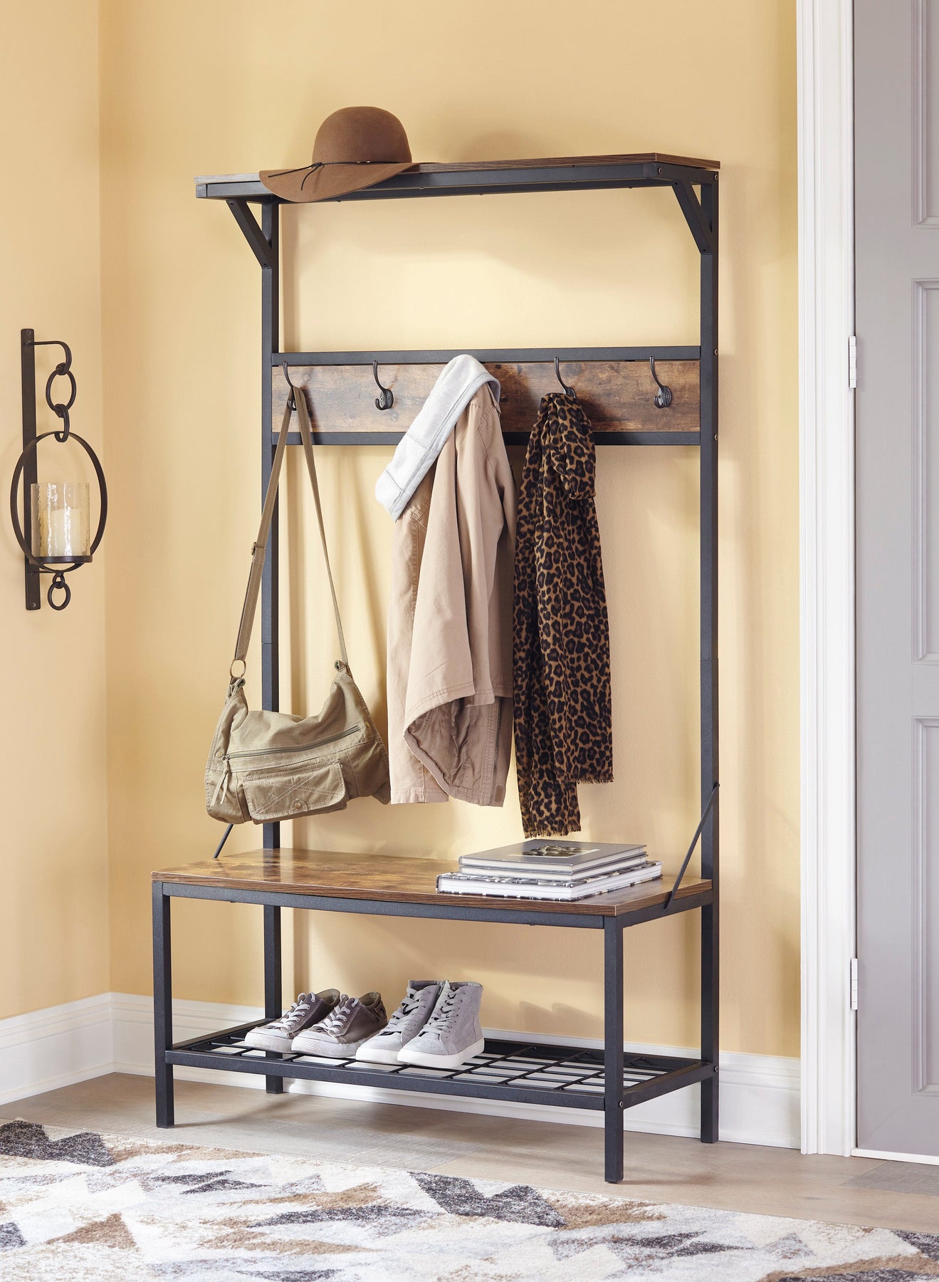 The rugged good looks of this hall tree were inspired by vintage pieces from yesteryear. Upper and lower shelves offer convenient storage and display space for belongings and baskets. The warm wood tone and black metal frame merge weathered character with a modern edge. Substantial seat makes urban industrial style look wonderfully welcoming.