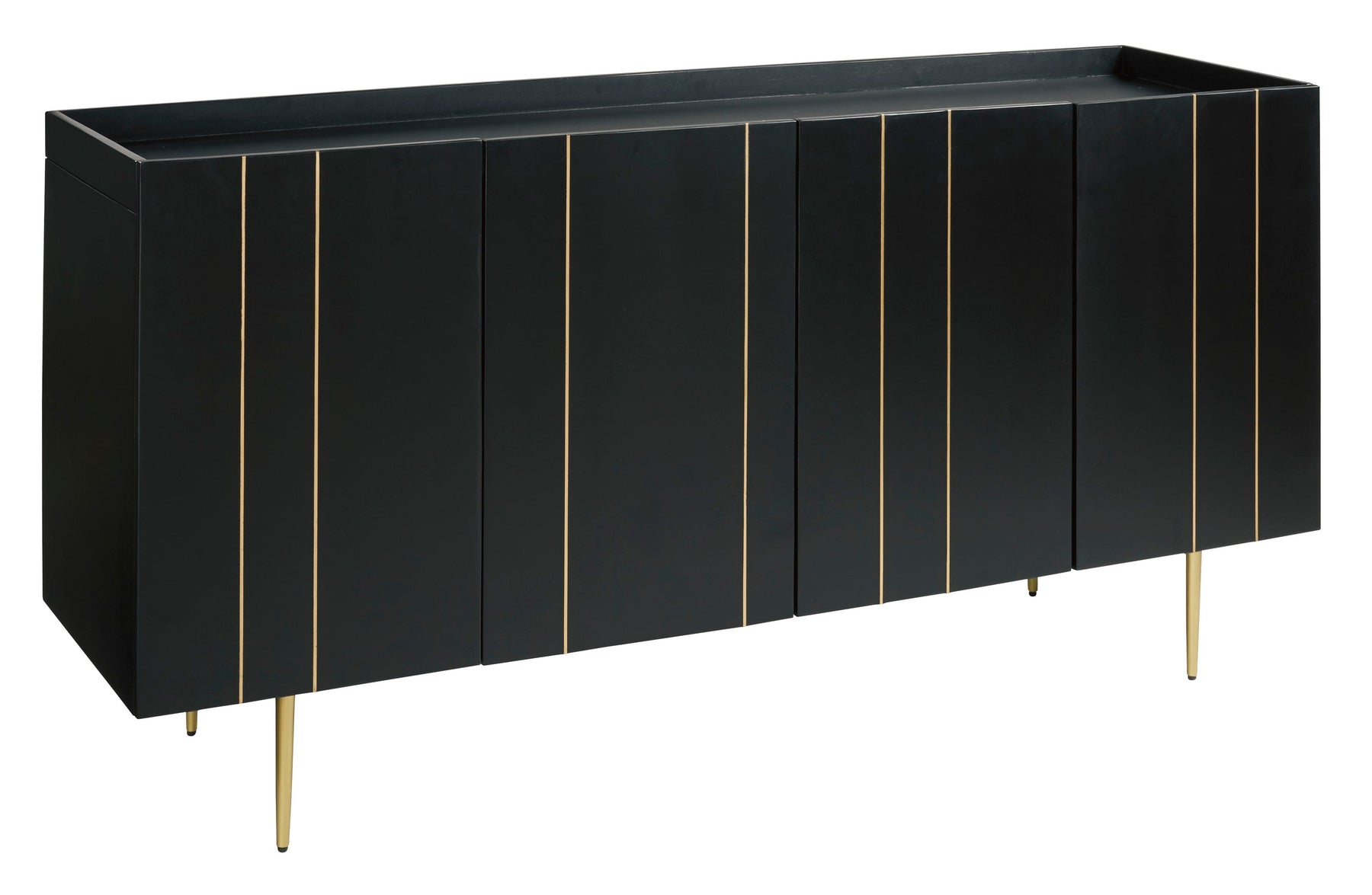 This accent cabinet is beautifully aligned with your love of contemporary style with a high-glam twist. Finished in brilliant black, this quality crafted accent cabinet is enriched with thin brass inlays and tapered metal legs in a brass-tone finish for upscale appeal.