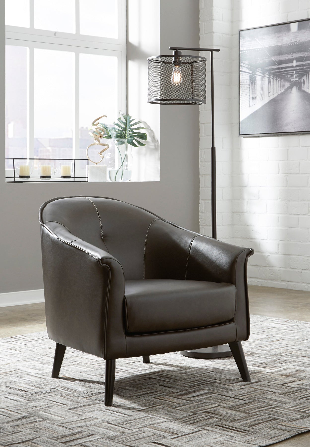 Traditional collides with contemporary in this accent chair. Flare arms, contrast stitching and tapered wood legs add a certain modernity to a classic club chair silhouette in dark brown faux leather upholstery.