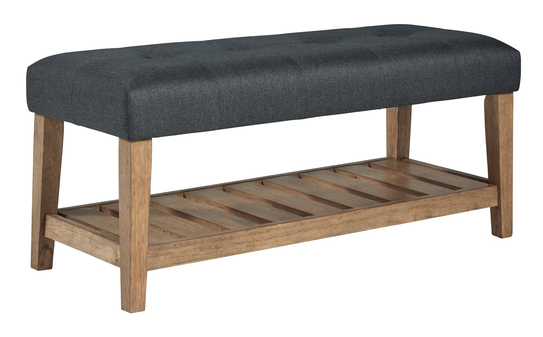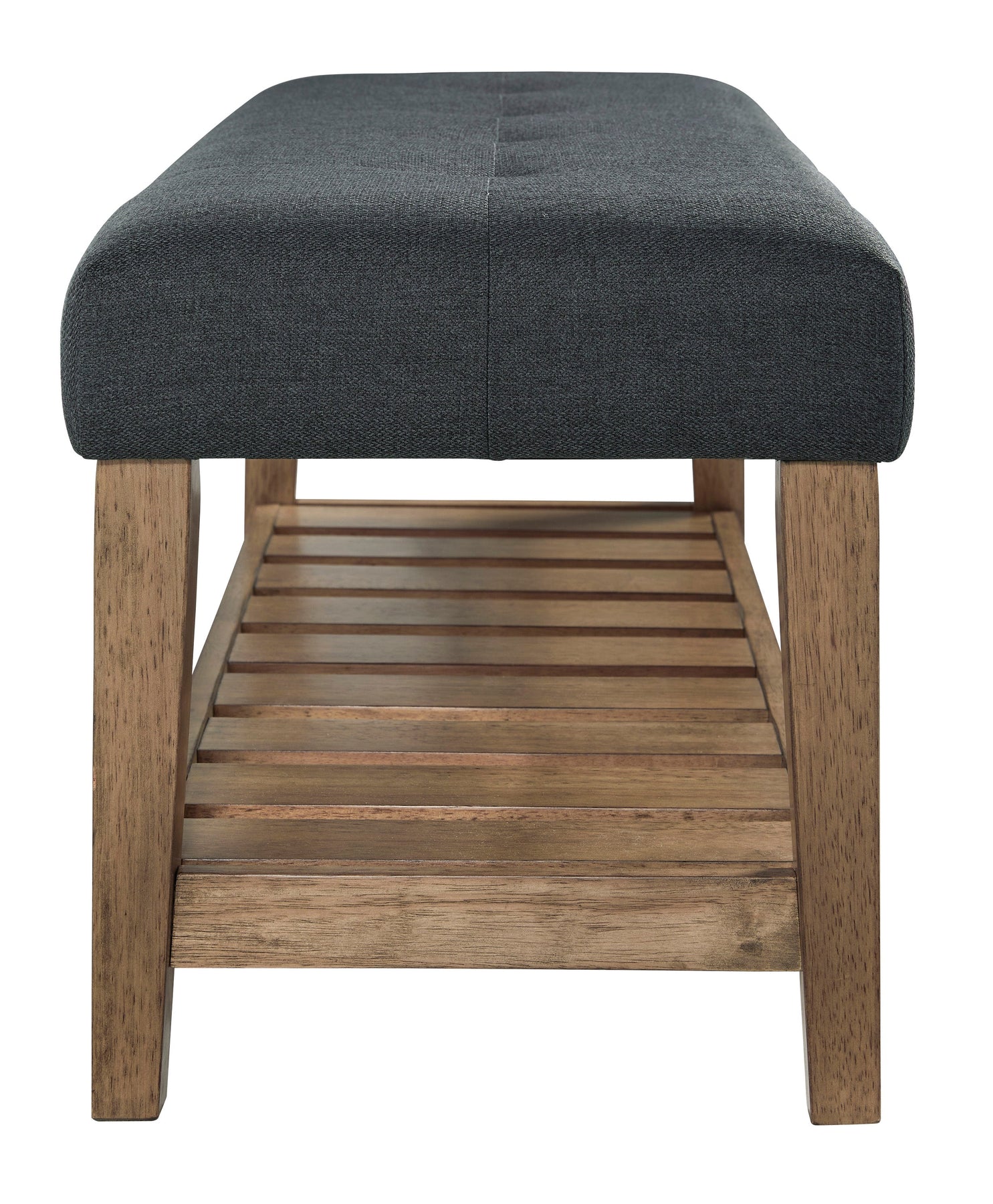 The solid construction and timeless style of this bench make it the perfect accent piece in your living room, bedroom or entryway. A wood slat storage shelf and cushioned top add a sense of airy sophistication and charming rustic style.