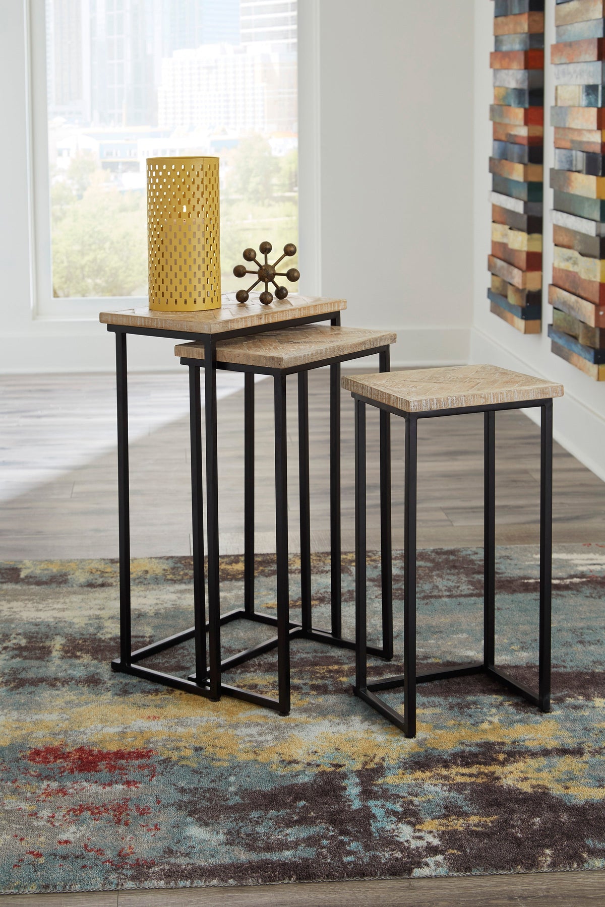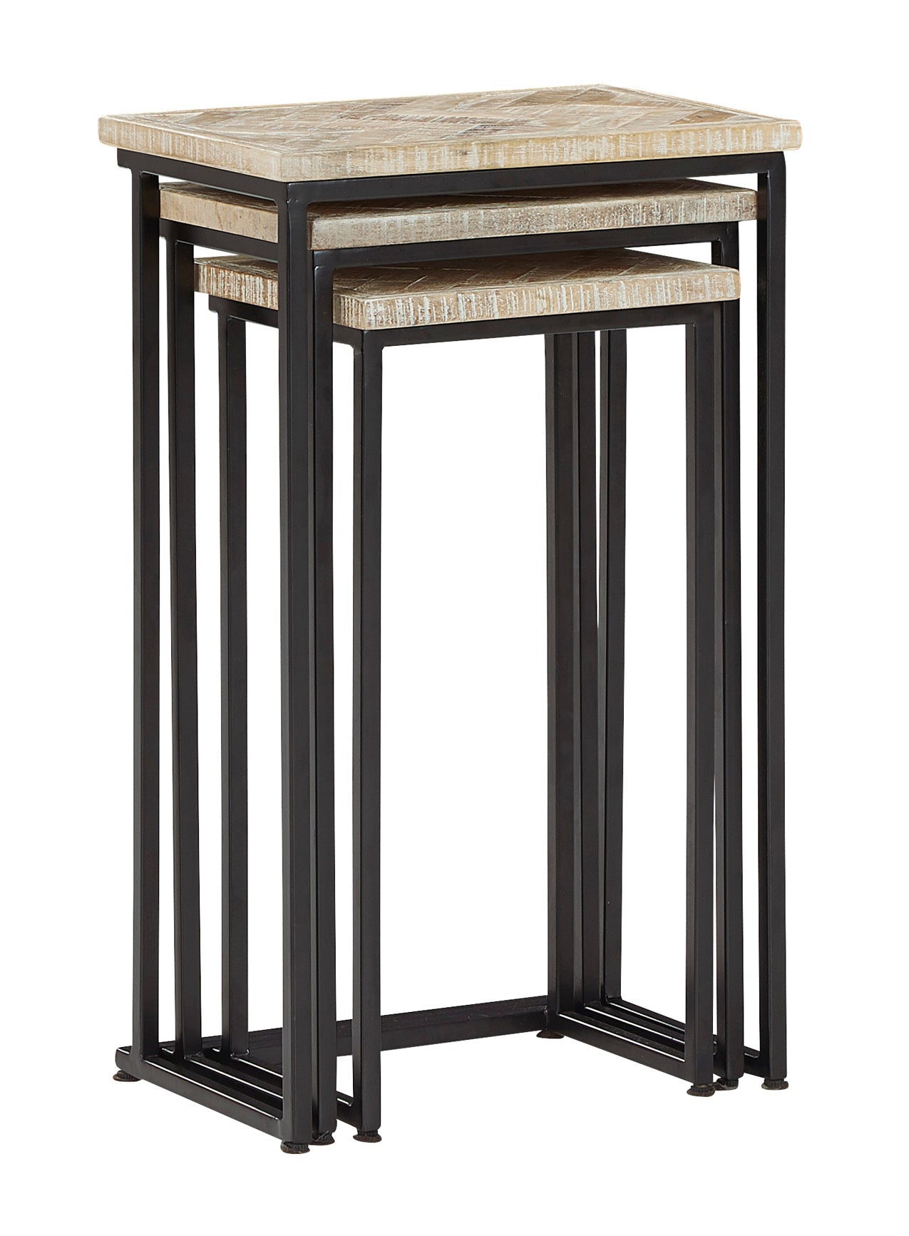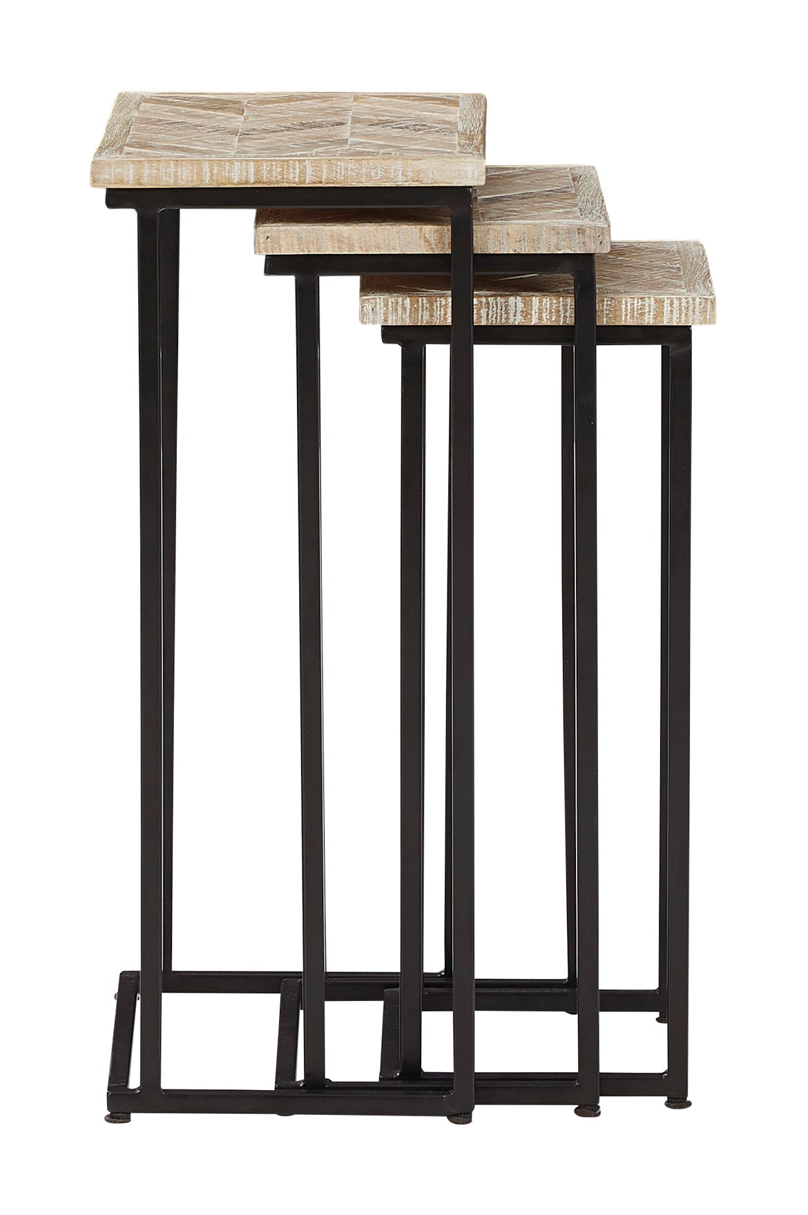 Spruce up your home as easy as 1,2,3. This nesting set of three accent tables will elevate your space with ease. The chevron pattern tops lend a geometric touch. The distressed white and black finished metal make these accent tables versatile pieces for any room.
