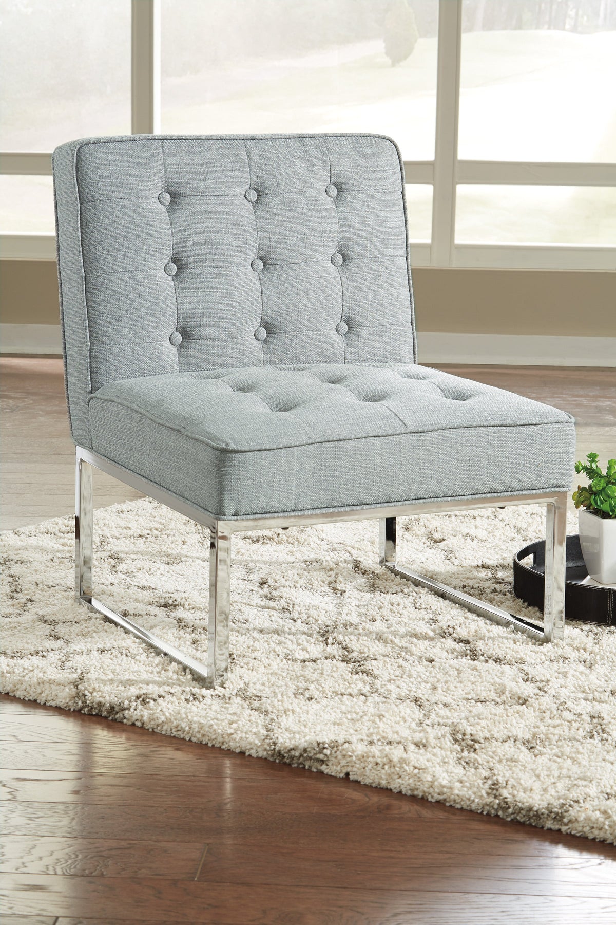 Button-tufted seat? Yes, please. This armless accent chair allures with contemporary appeal. Gorgeous chrome-tone base supports two comforting light gray cushions. Its neutral aesthetic complements your home with an upscale touch.