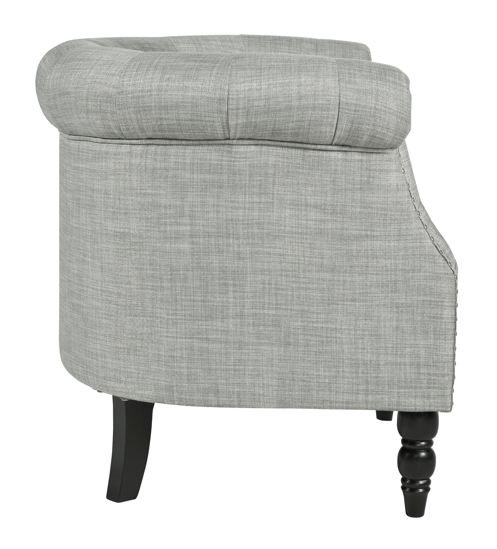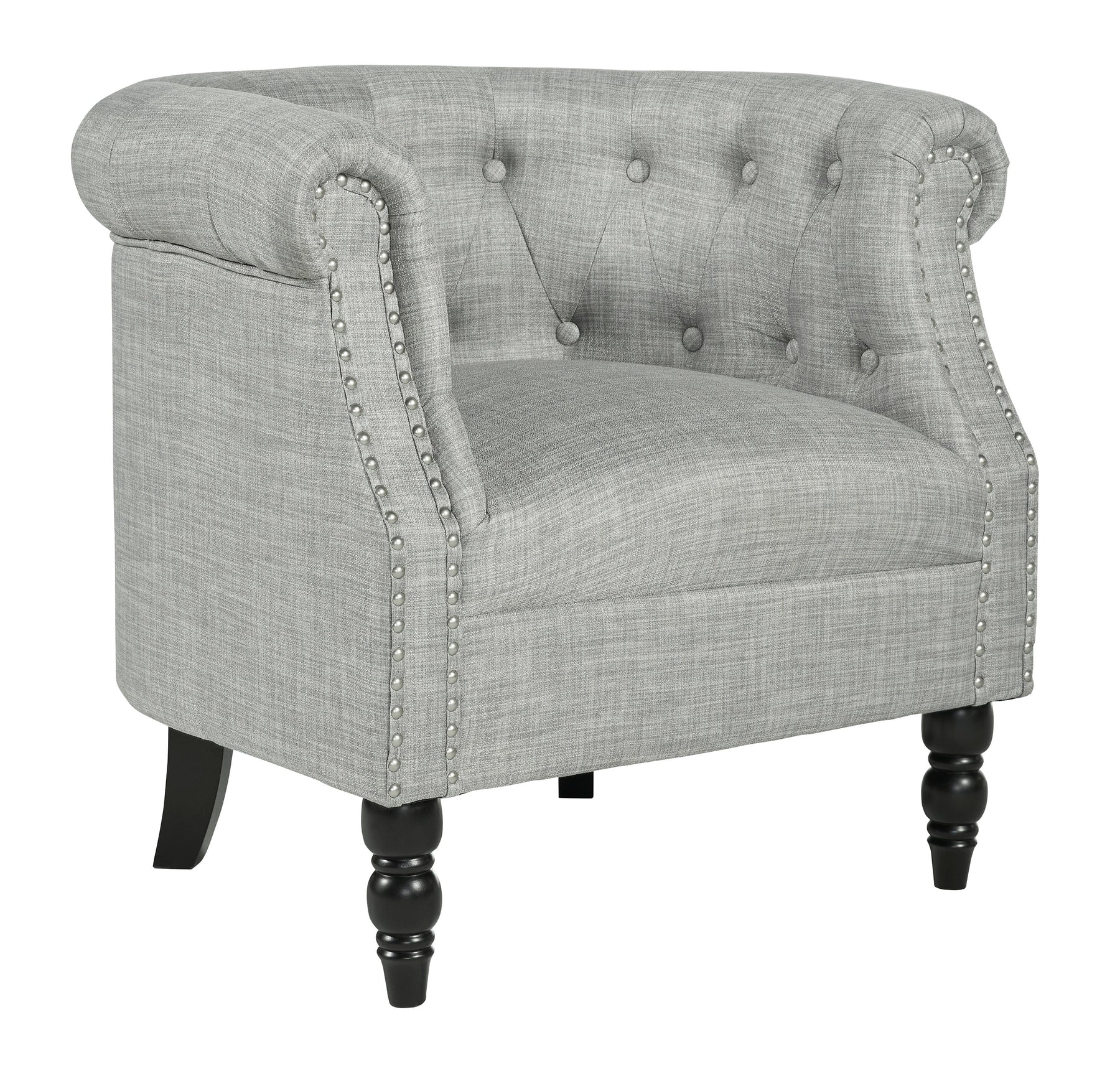 Rounding out your decor while providing sensible seating arrangements in small spaces, side chairs offer style and versatility to any interior design. Adding the statement-making appeal of glam style to your abode, this armchair features a rounded back, two scrolled arms and button-tufted accents around the back. An eye-catching nailhead trim and turned wood legs accent the solid color of the polyester upholstery.
