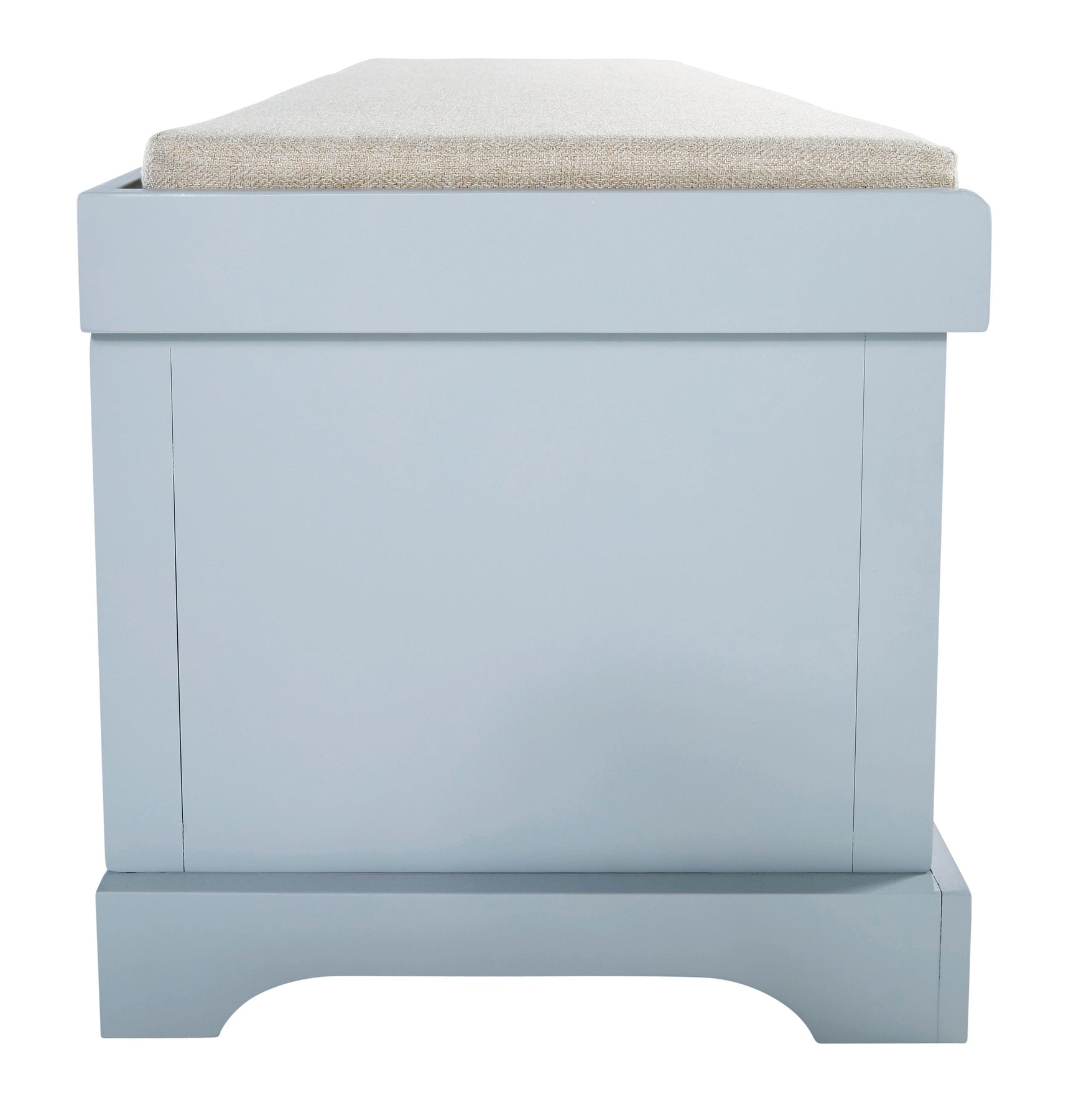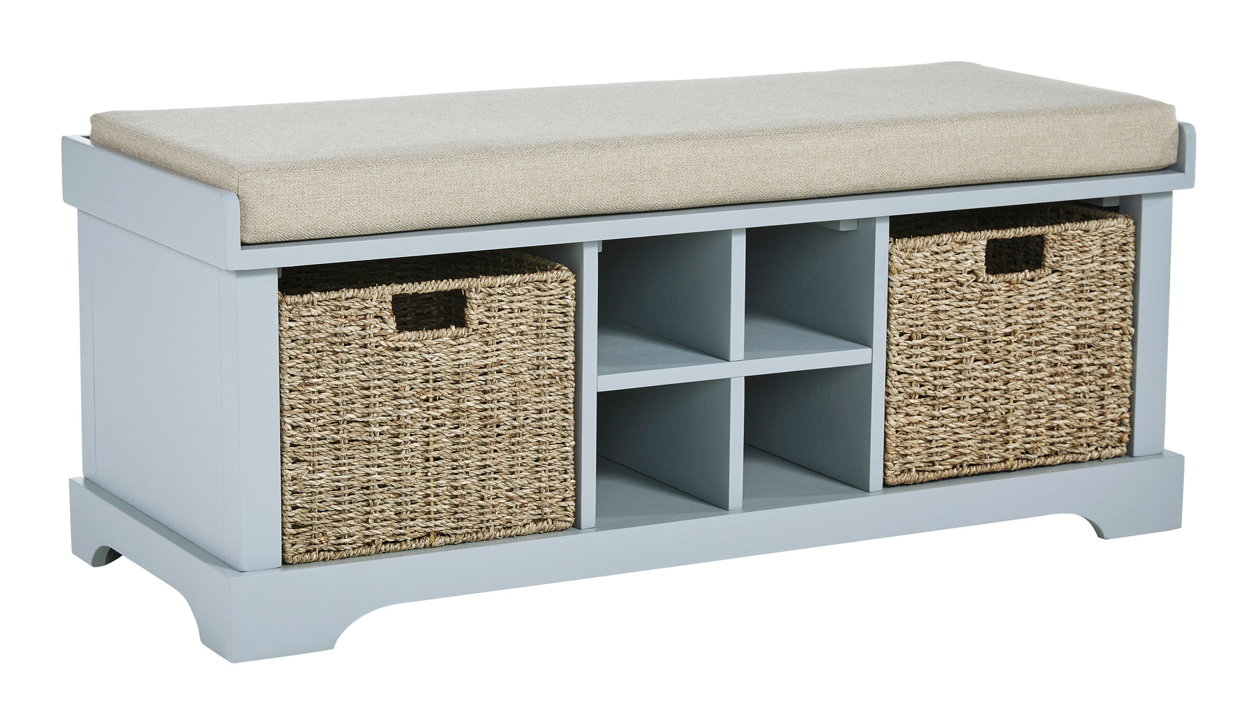 From providing spare seating to storing shoes and more, this storage bench is a must-have in any abode. Two open cubbies accommodate woven wicker baskets (included) to store everything from blankets to toys, while the upholstered seat cushion is filled with comfortable padding for extra support.