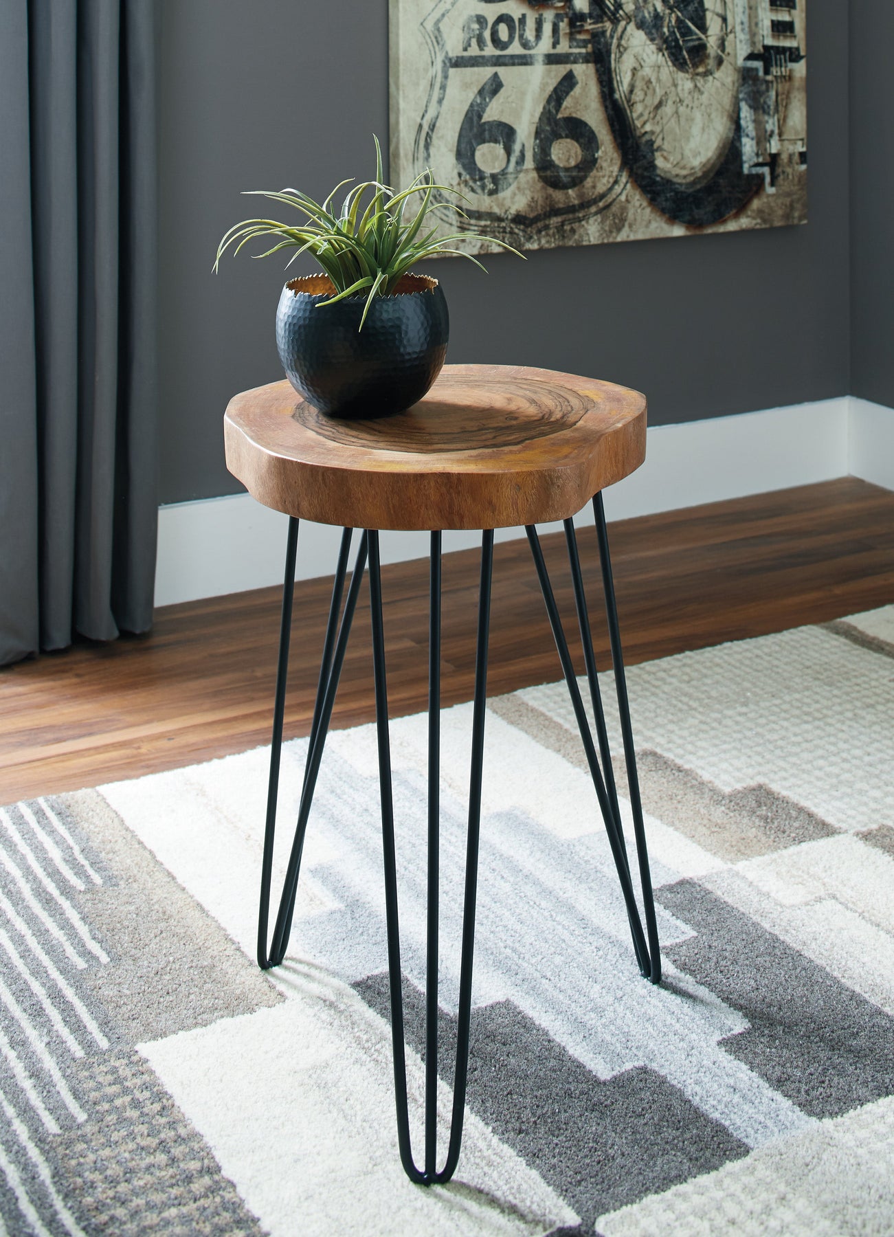 Our secret is simple--natural style. This accent table flawlessly merges natural finished wood with angular black finished metal legs. Faux live edge on the tabletop pushes boundaries to bring the outside inside.