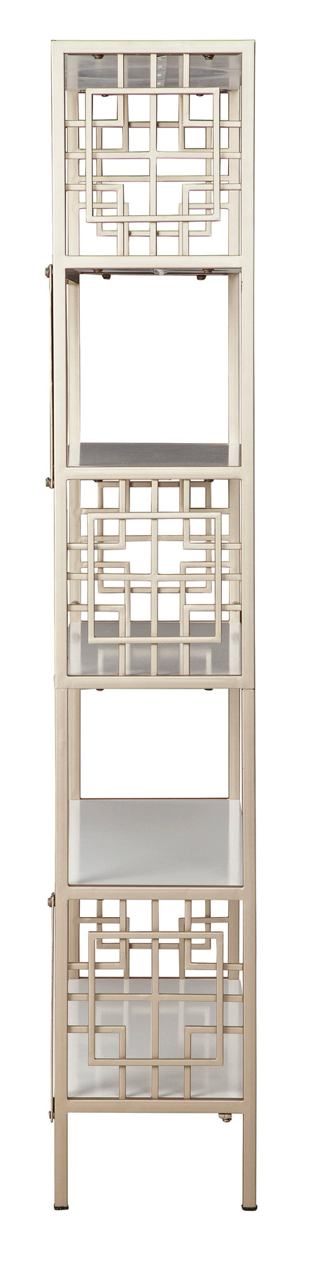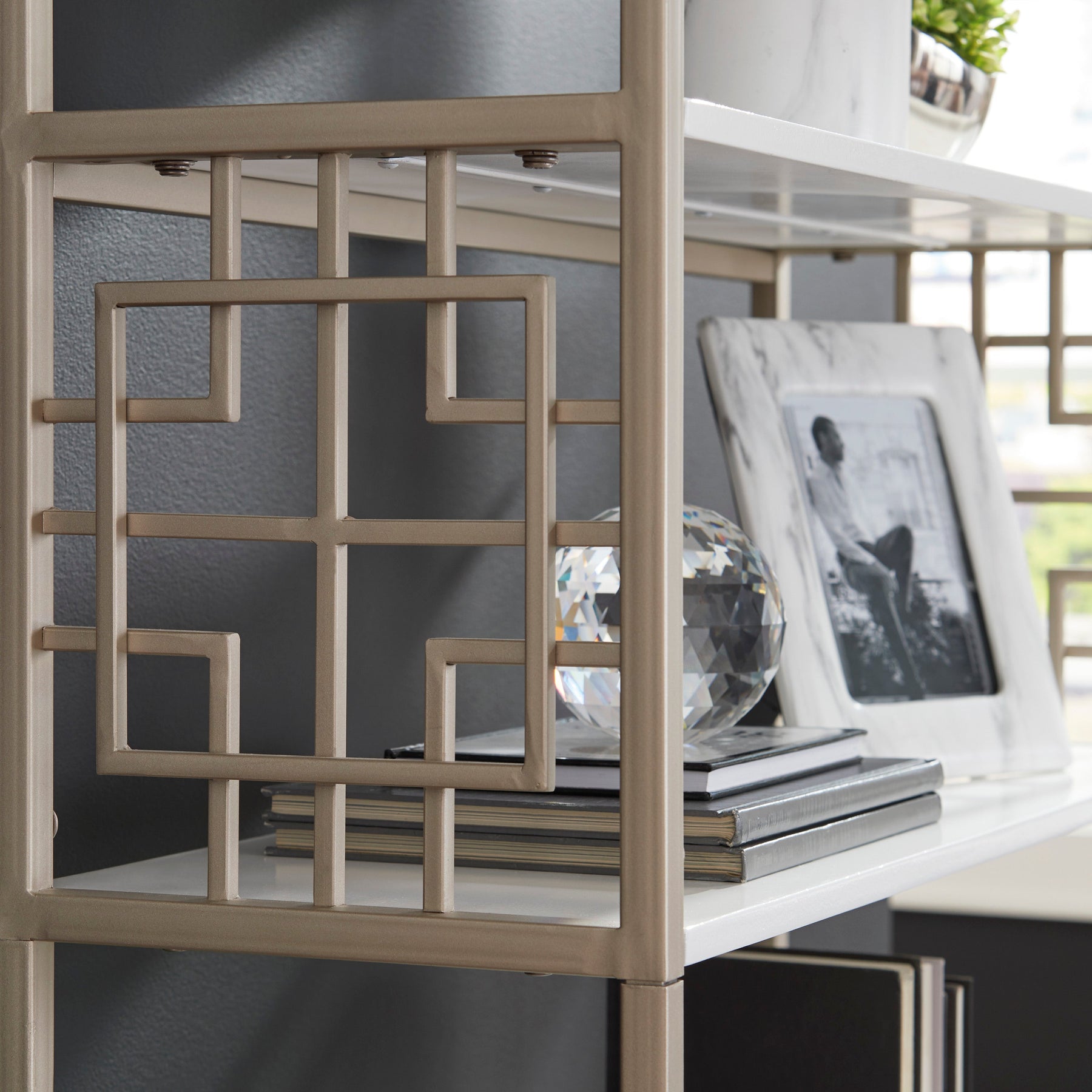 Showcase your book collection or decorative pieces with this dynamic bookcase. The geometric metal designs in a champagne finish that line the sides of the bookcase add the contemporary feel you are looking for. The six fixed shelves in a white finish provide the perfect amount of display or storage space.