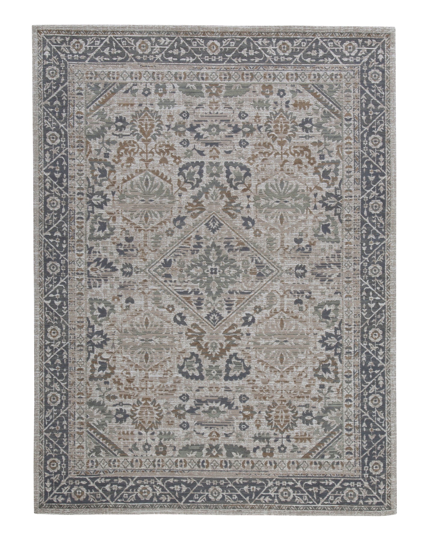 Roll out a sense of tradition with this elegantly styled area rug with medallion design. Muted palette of cool tones is simply a dream. Cottony soft weave is sure to please.