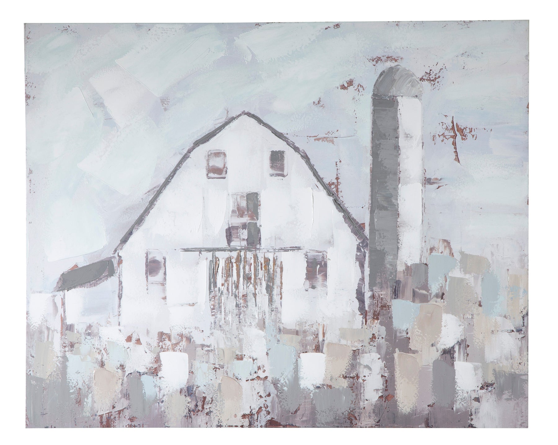 Make your modern farmhouse or cozy cottage complete with this brilliant rendition of barn wall art. Muted palette blends shades of blue, gray and white for a fabulously faded aesthetic. Gallery wrapped canvas is right on trend.