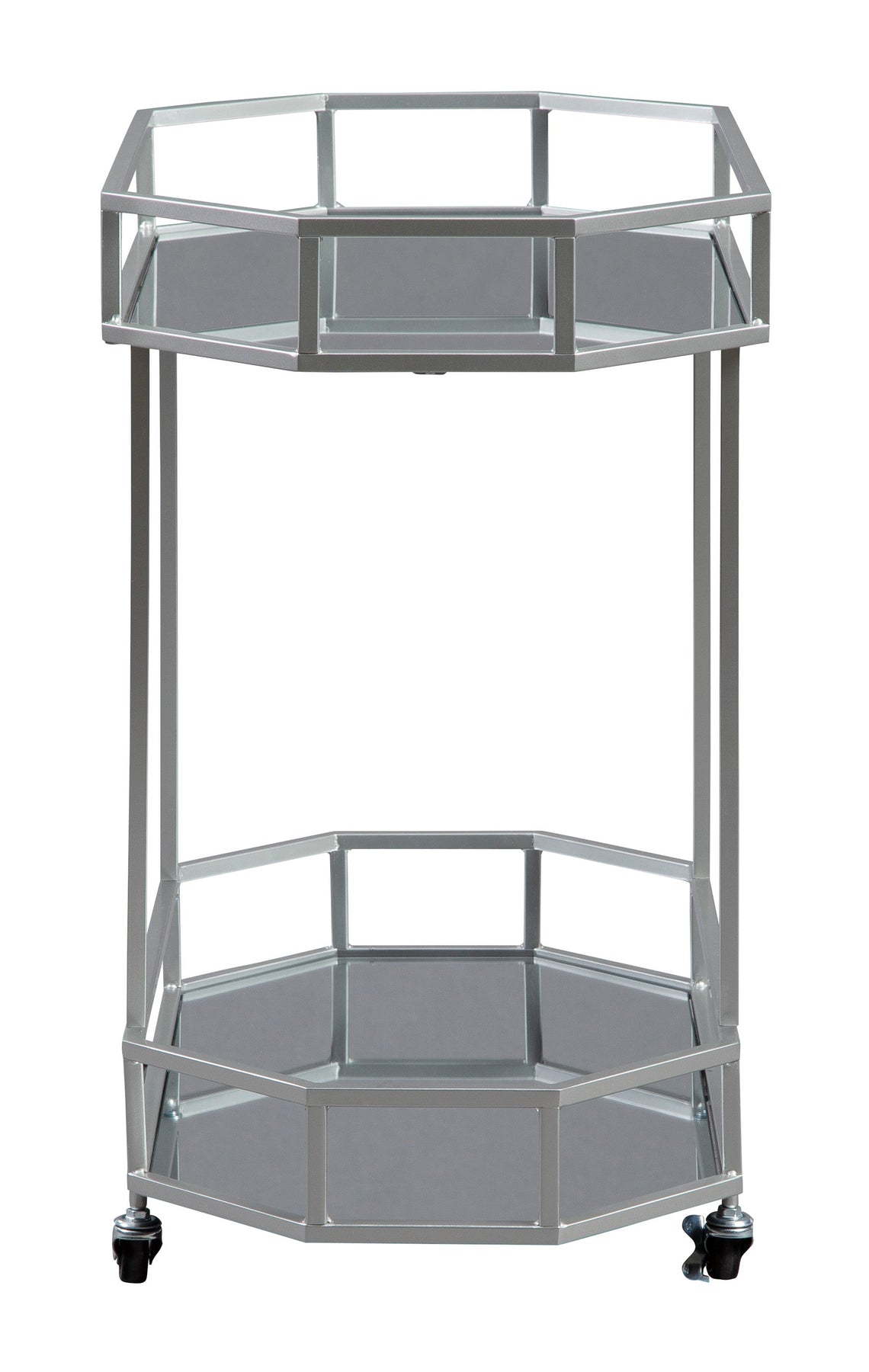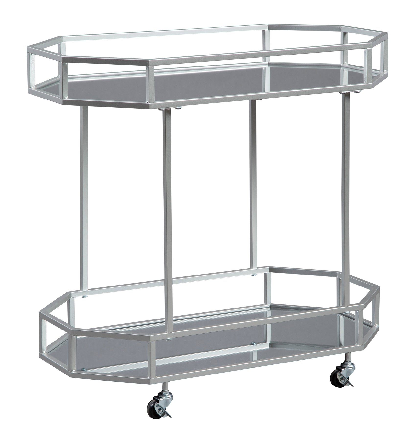 This bar cart entices with high glam appeal that knows how to strike a stylish pose. Glass shelves are a trendy complement to the silvertone finished metal. Its open concept frame has plenty of chic panache to accompany drinks and glassware. Convenient caster wheels make transport a breeze.