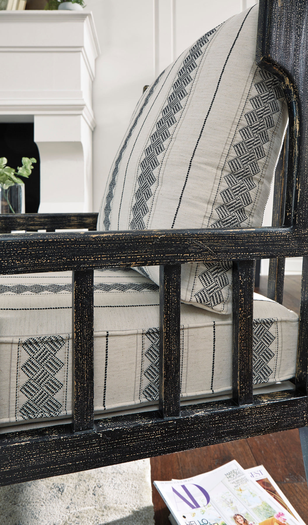 Add some global-chic style to your domicile with this designer accent chair. Looking so much better for the wear, the sturdy wood frame charms in a distressed black finish. Covered in an ivory and black tribal pattern, reversible cushions enhance the casual coolness.