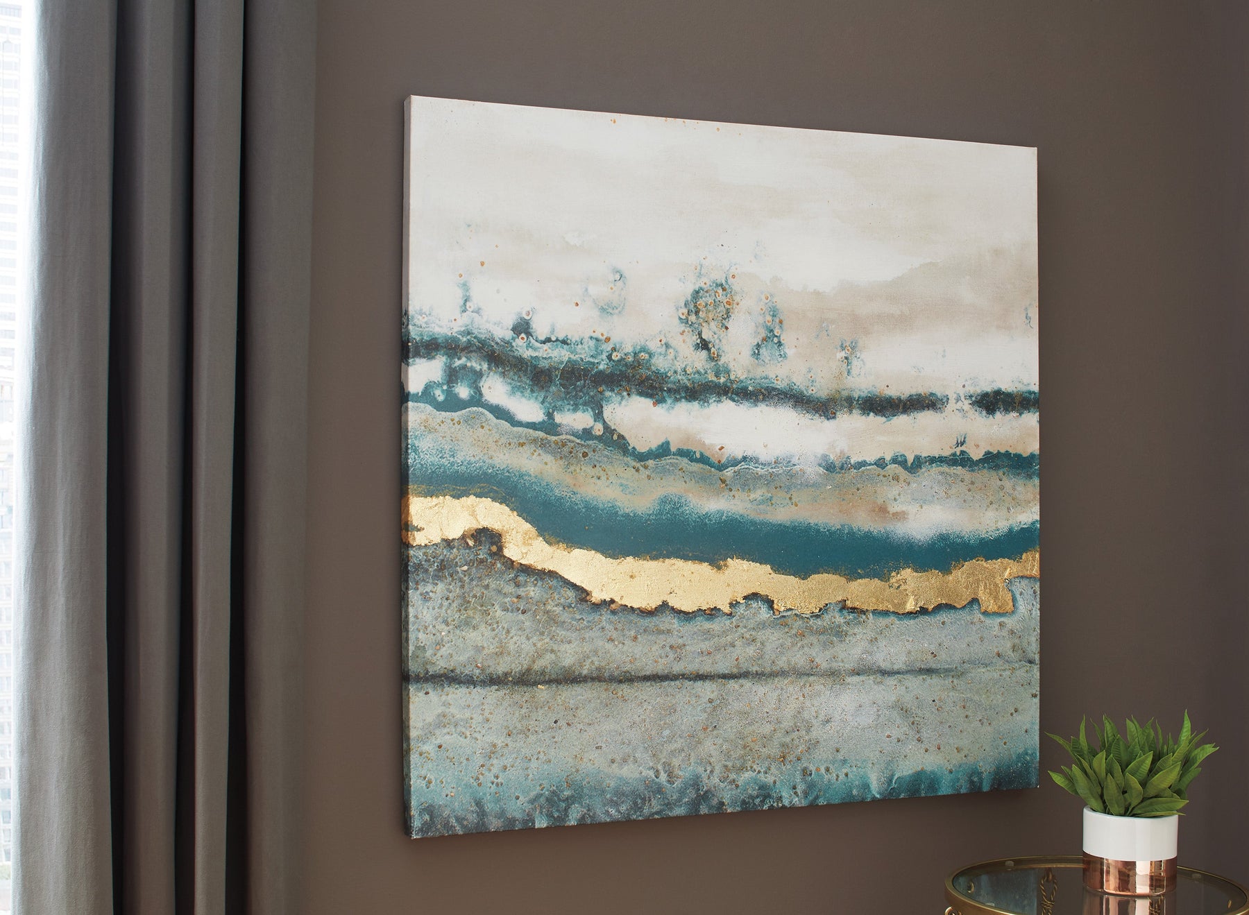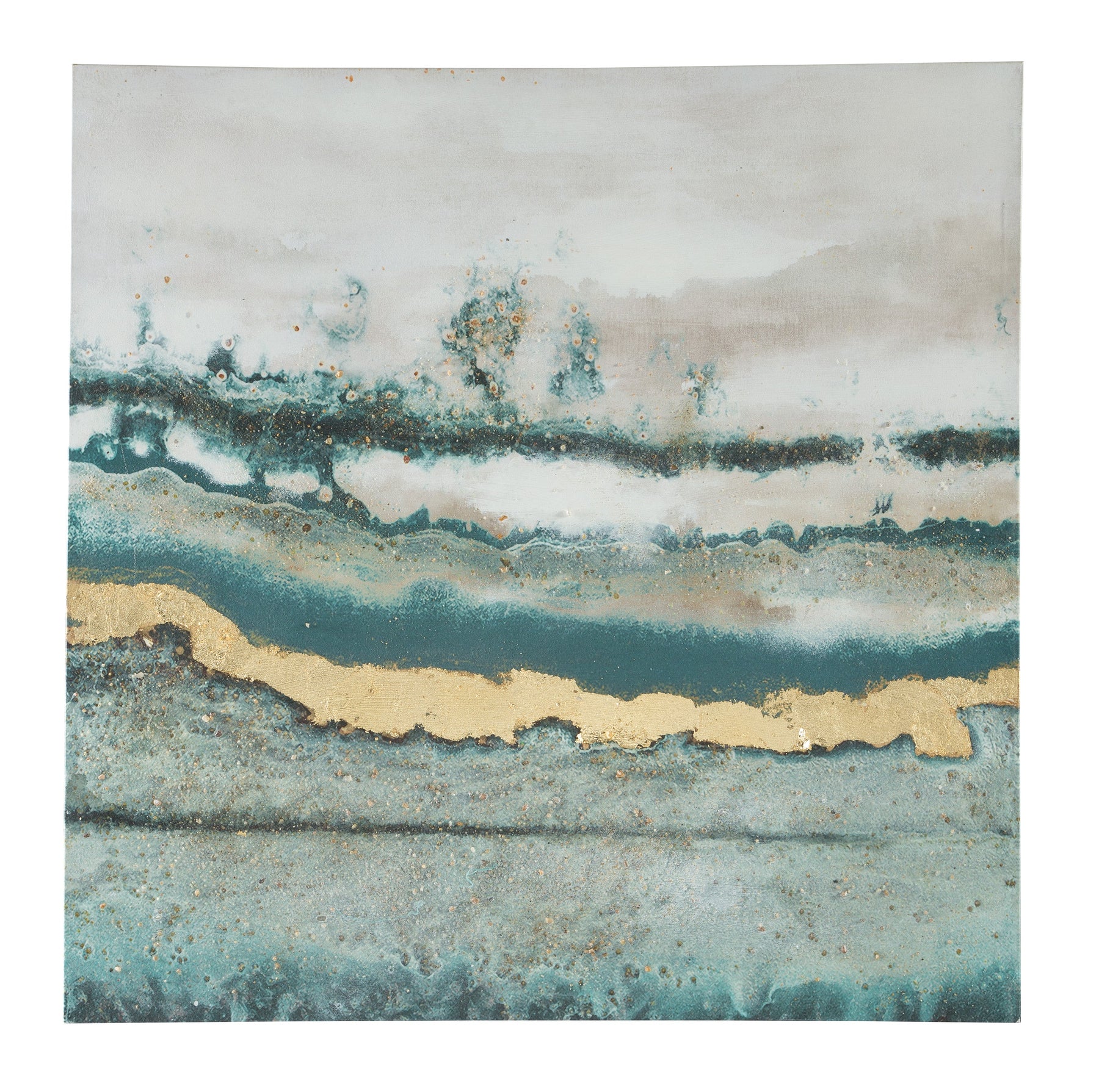 This wall art showcases a serene sea abstraction. Shades of turquoise and white flow with rhythmic depth, embellished with gold leaf. Textured element of the hand-painted visual makes each piece a unique beauty. Its contemporary appeal elevates your neutral room with style and color.