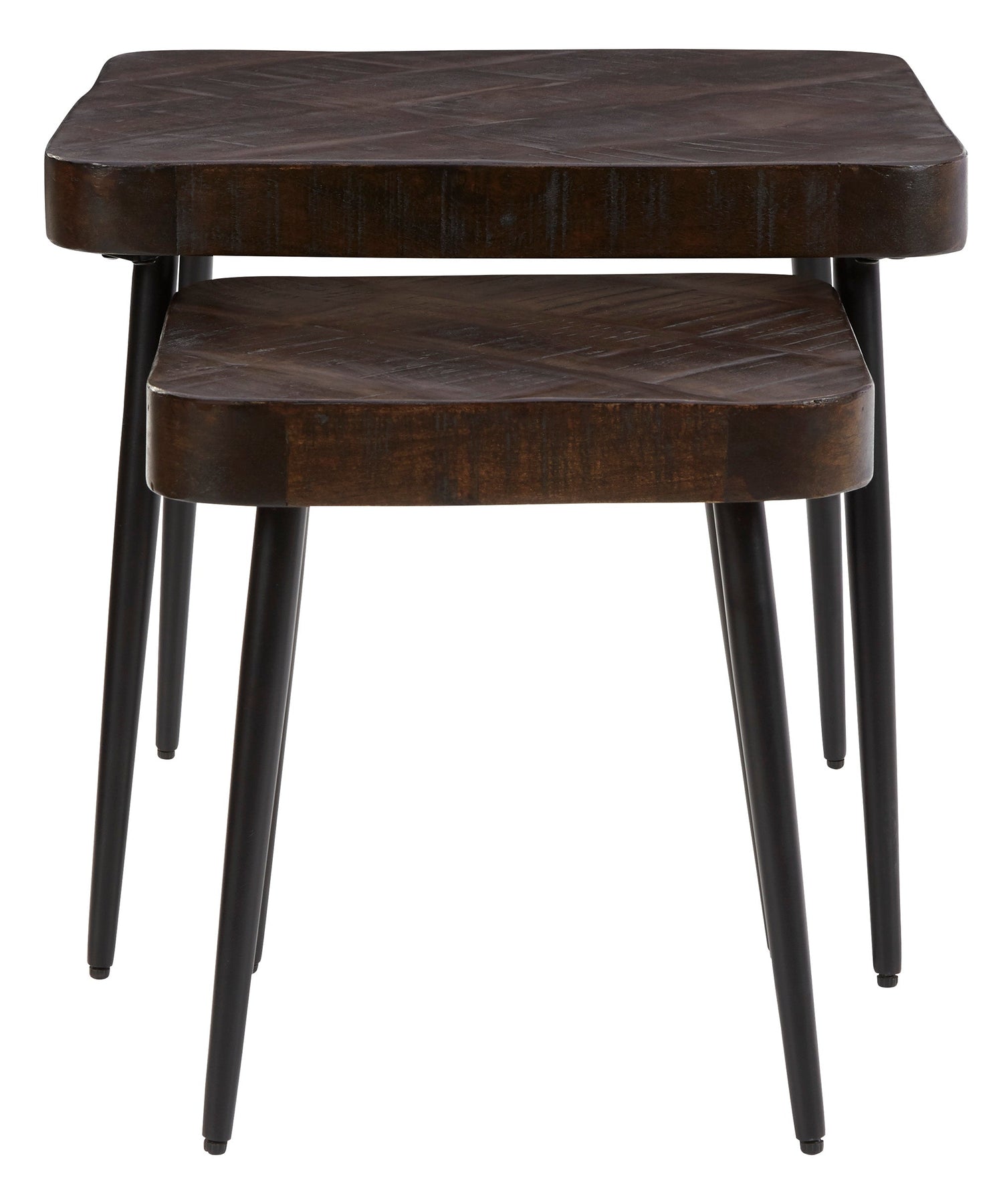 Texture and silhouette take center stage in this set of accent tables. With beautiful, distressed, brown finished tabletops above black finished metal legs, these tables highlight the natural beauty of the materials above fussy design.