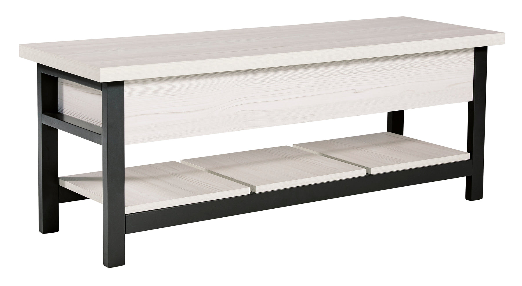 Seating with style and storage - what more could you need? This storage bench has a hinged seat and plank shelf, making it the perfect multi-use piece. The white wood grain effect lends a casual touch, while the black finished legs and supports create a dynamic contrast.