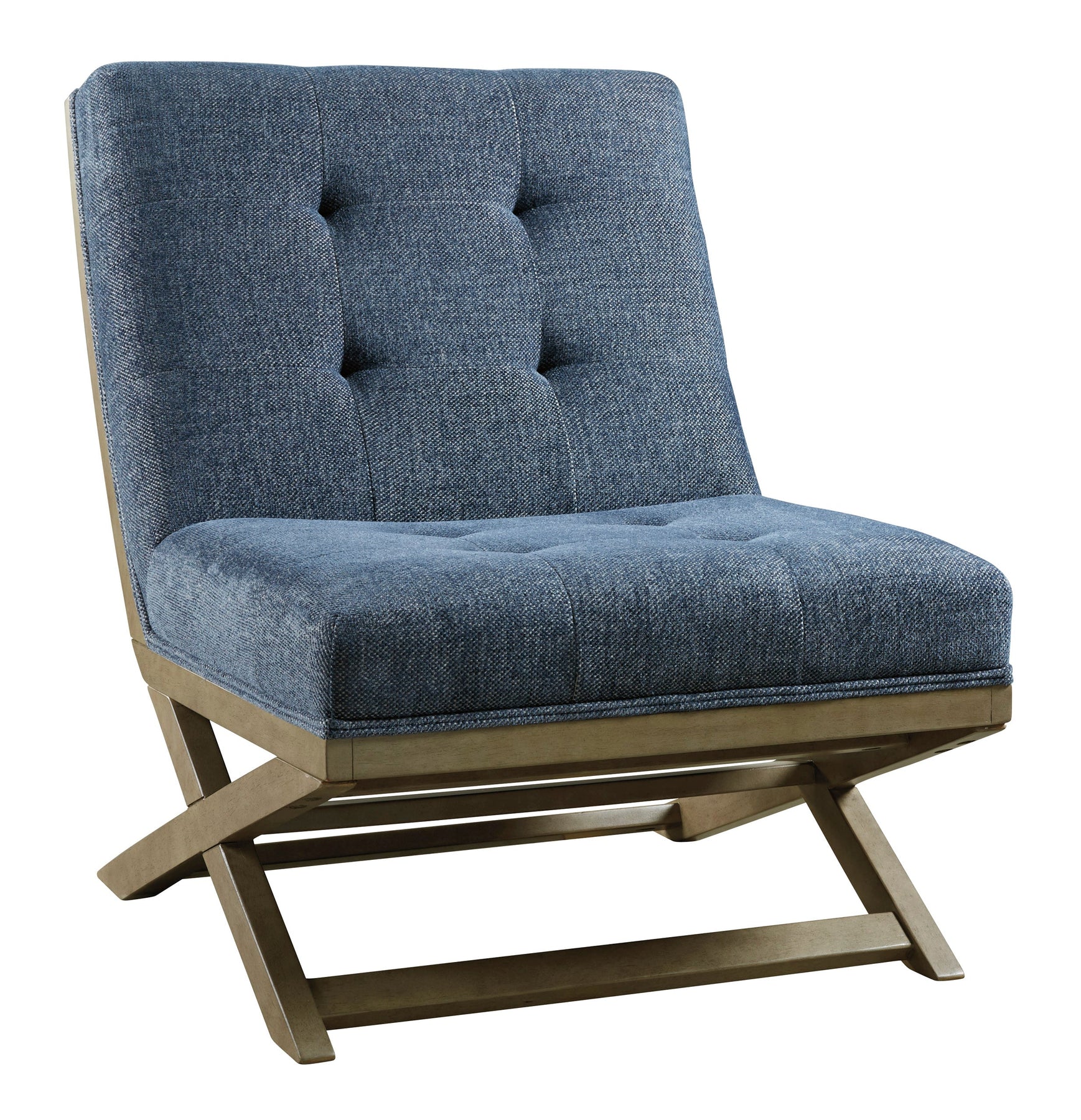 Take a comfy seat in this fashionable accent chair. Upholstered in a blue polyester blend fabric, you’ll love the way it feels. Tufted back adds a classy design element. Armless profile with “X” base makes it the perfect companion for open spaces.