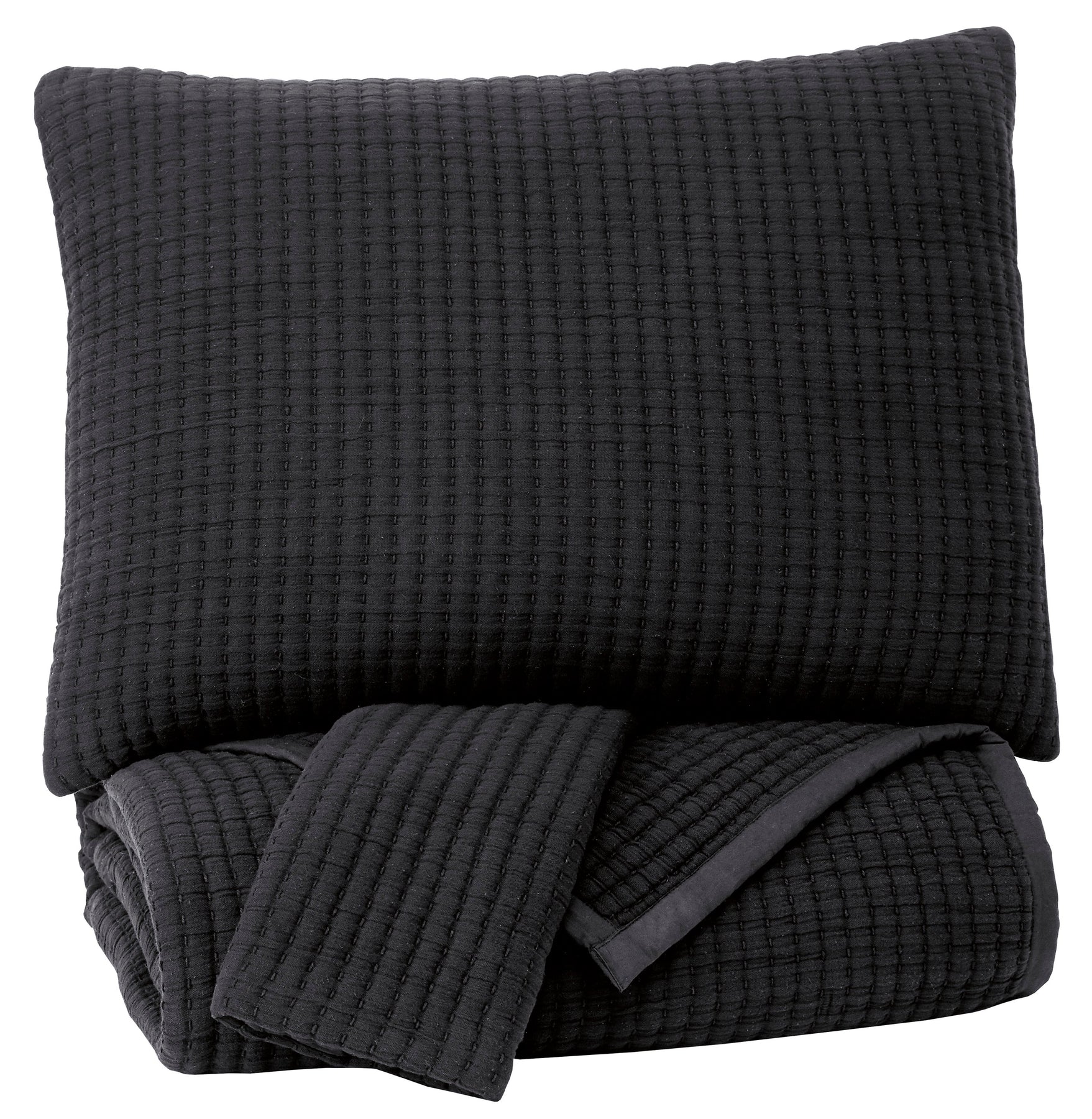 Brilliantly simple and simply brilliant. With its pick stitched texture, this king coverlet set in black has you covered with dramatic tone and rich texture. Cotton cover brings a dreamy touch.