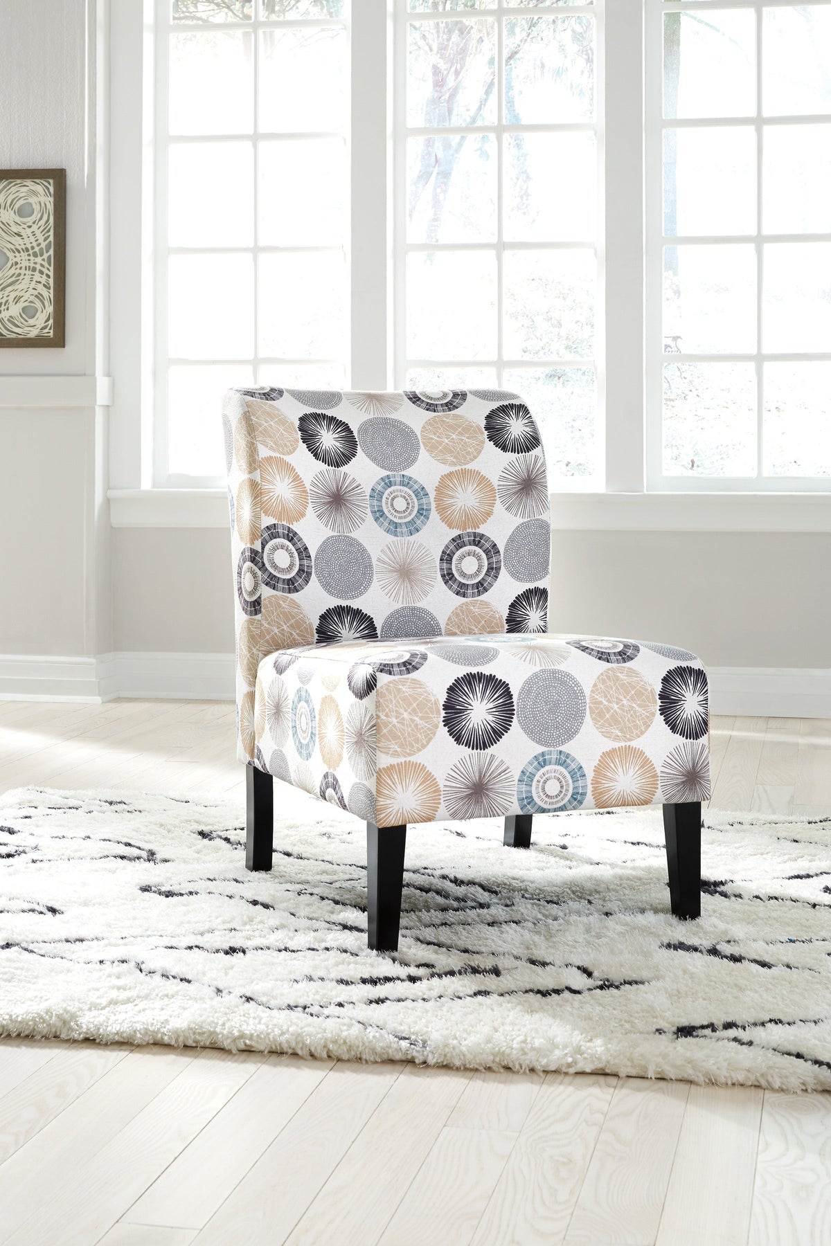 This trendy accent chair adds a fun vibe to your home. Armless design is perfect for small spaces that need a spark of excitement. Contemporary pattern in shades of charcoal and tan covers the soft fabric. Supportive cushions bring in an element of comfort.