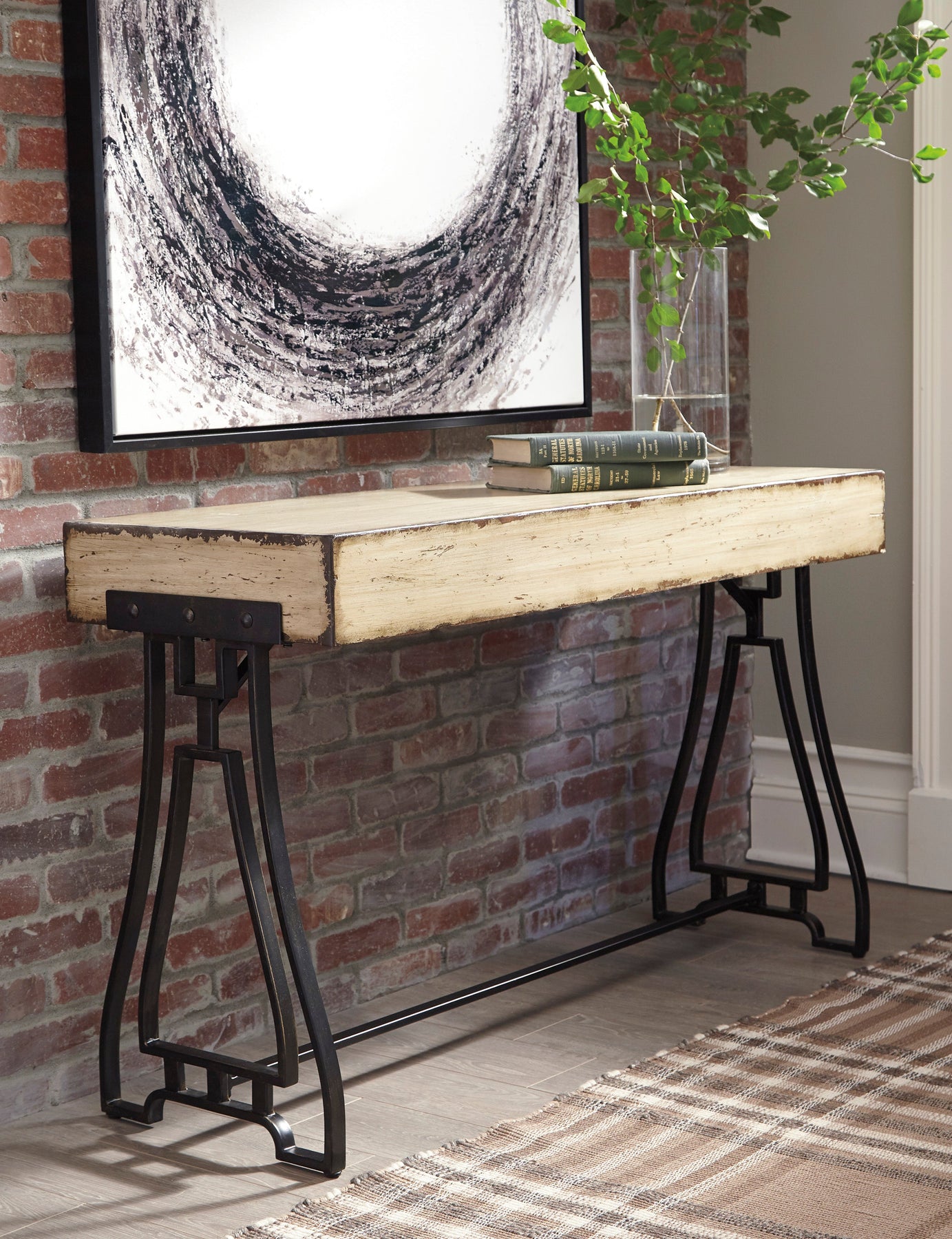 It’s all about that base with this console sofa table. Antiqued cream finish wood with dark edges infuses urban character into your home. Metal base elevates the style factor with an attractive open, geometric design. Make it yours by fashioning it with handsome decor in the entryway or behind your sofa.